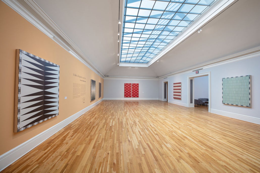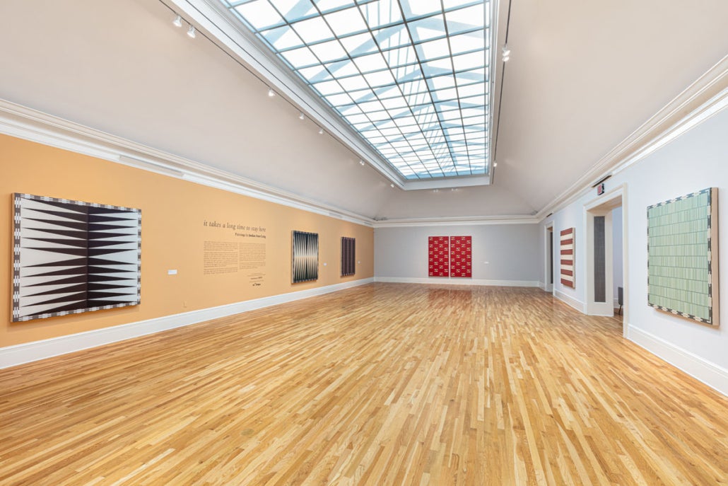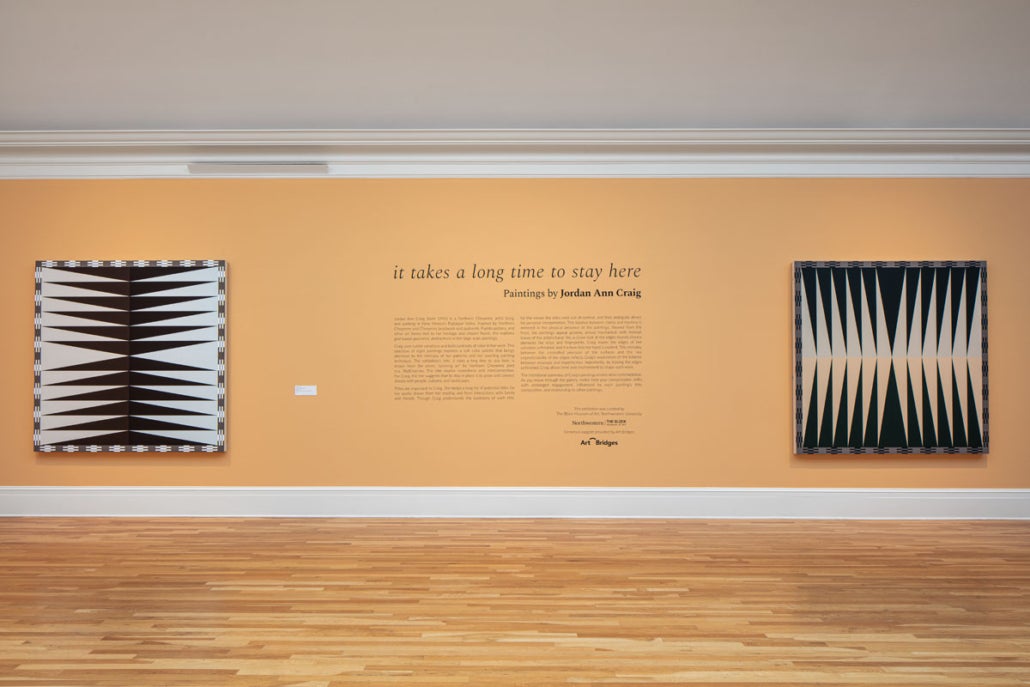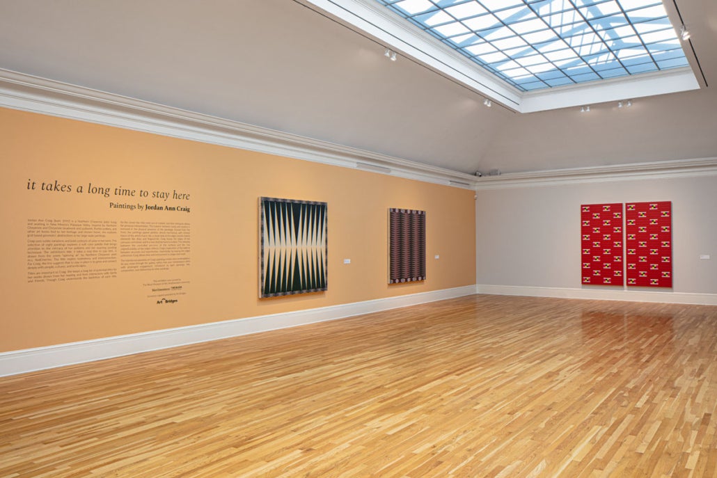 it takes a long time to stay here is artist Jordan Ann Craig’s (Northern Cheyenne) largest institutional exhibition to date. Her large-scale abstract paintings reflect her engagement with Indigenous, especially NorthernCheyenne, aesthetic traditions and her dynamic and innovative exploration of color, line, and geometric form. Craig’s practice often begins with research in museum collections and archives—studying, learning from, and engaging in a dialogue with traditional Indigenous artistic forms, such as beadwork, pottery, and textiles. She also draws inspiration from the landscape of what is now the Southwestern United States, where she lives and works.